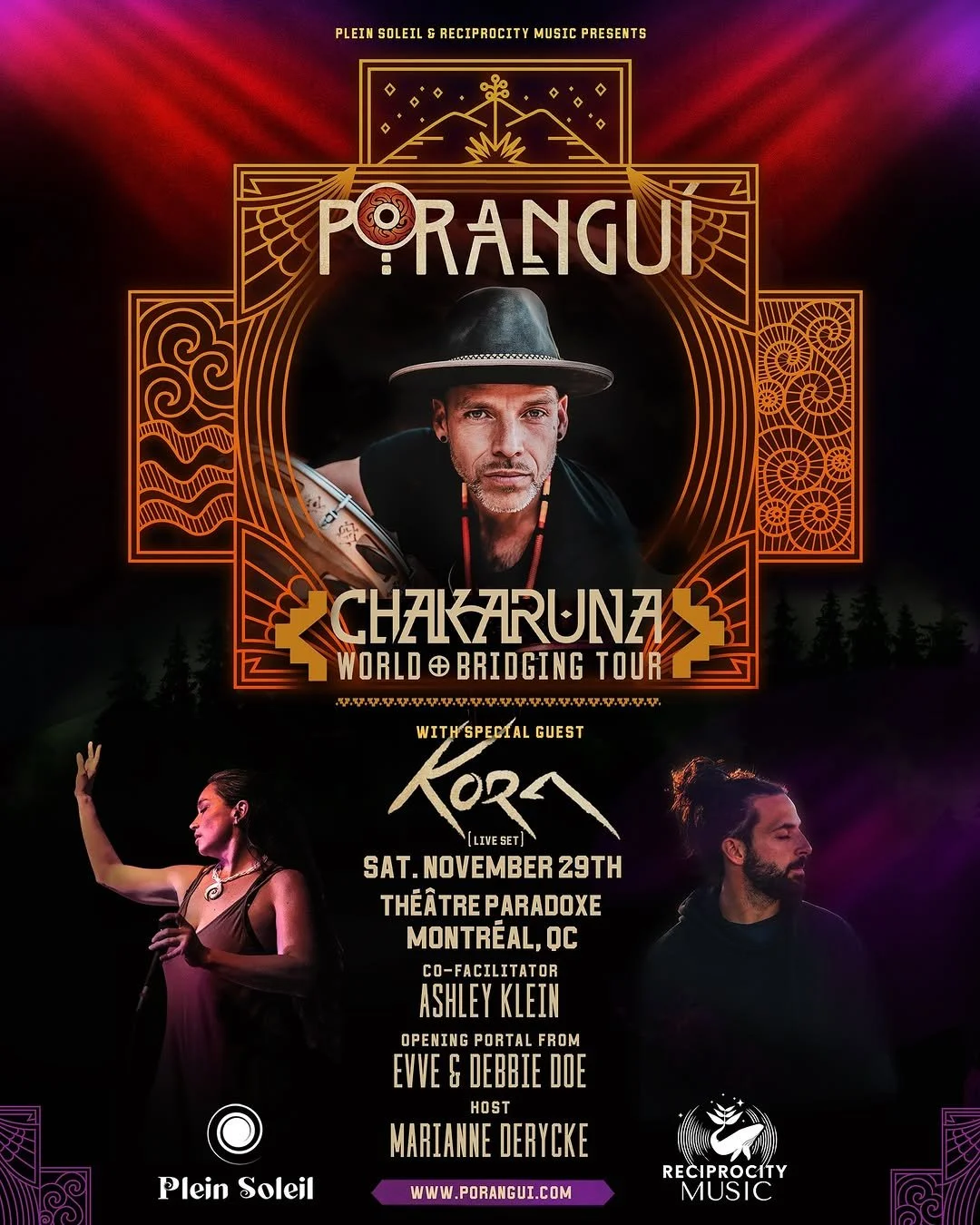 Plein Soleil and Reciprocity Music are proud to present Porangui Chakruna World Bridging Tour , Marianne, founder of Plein Soleil, is the MC of the night.